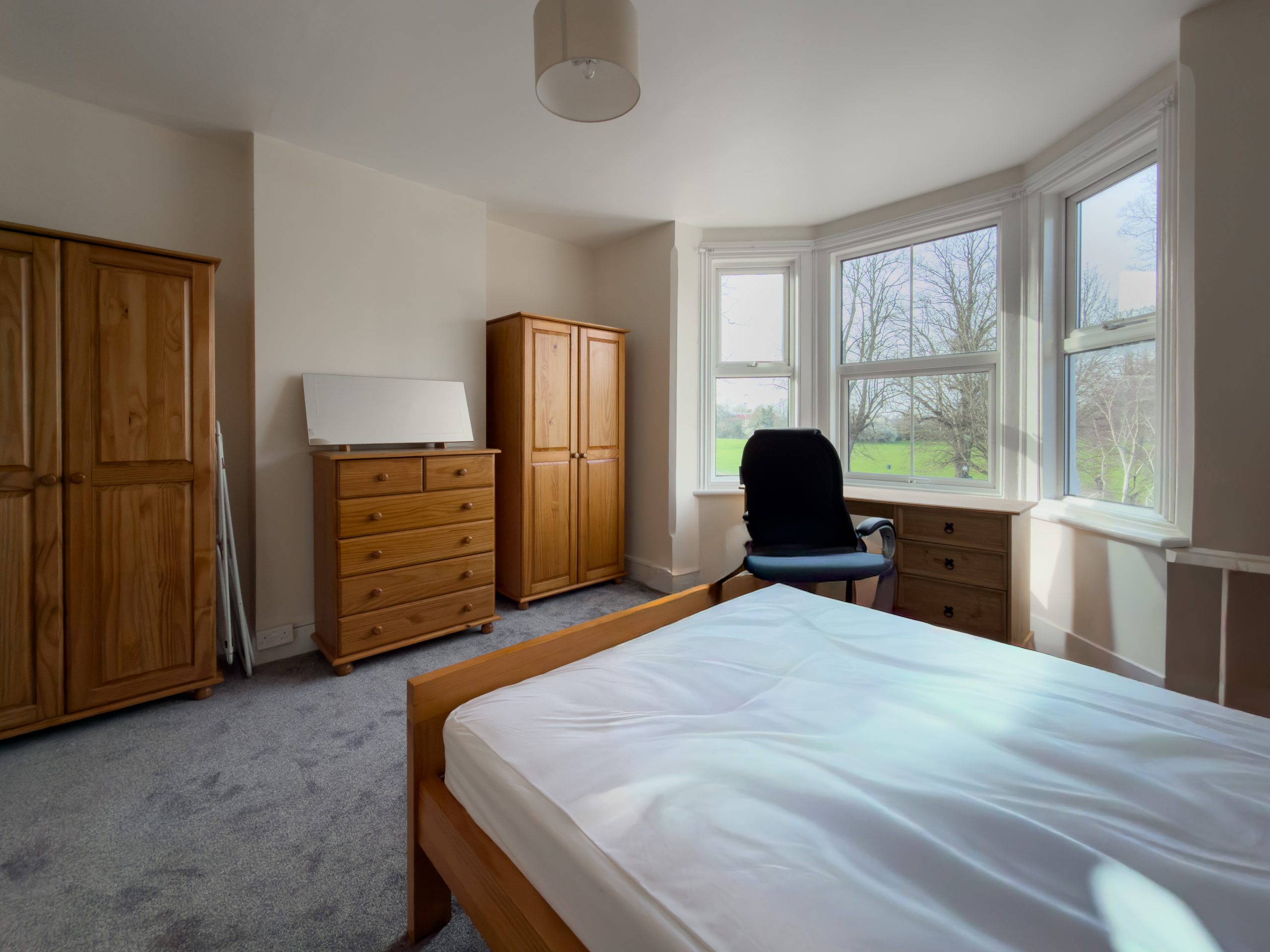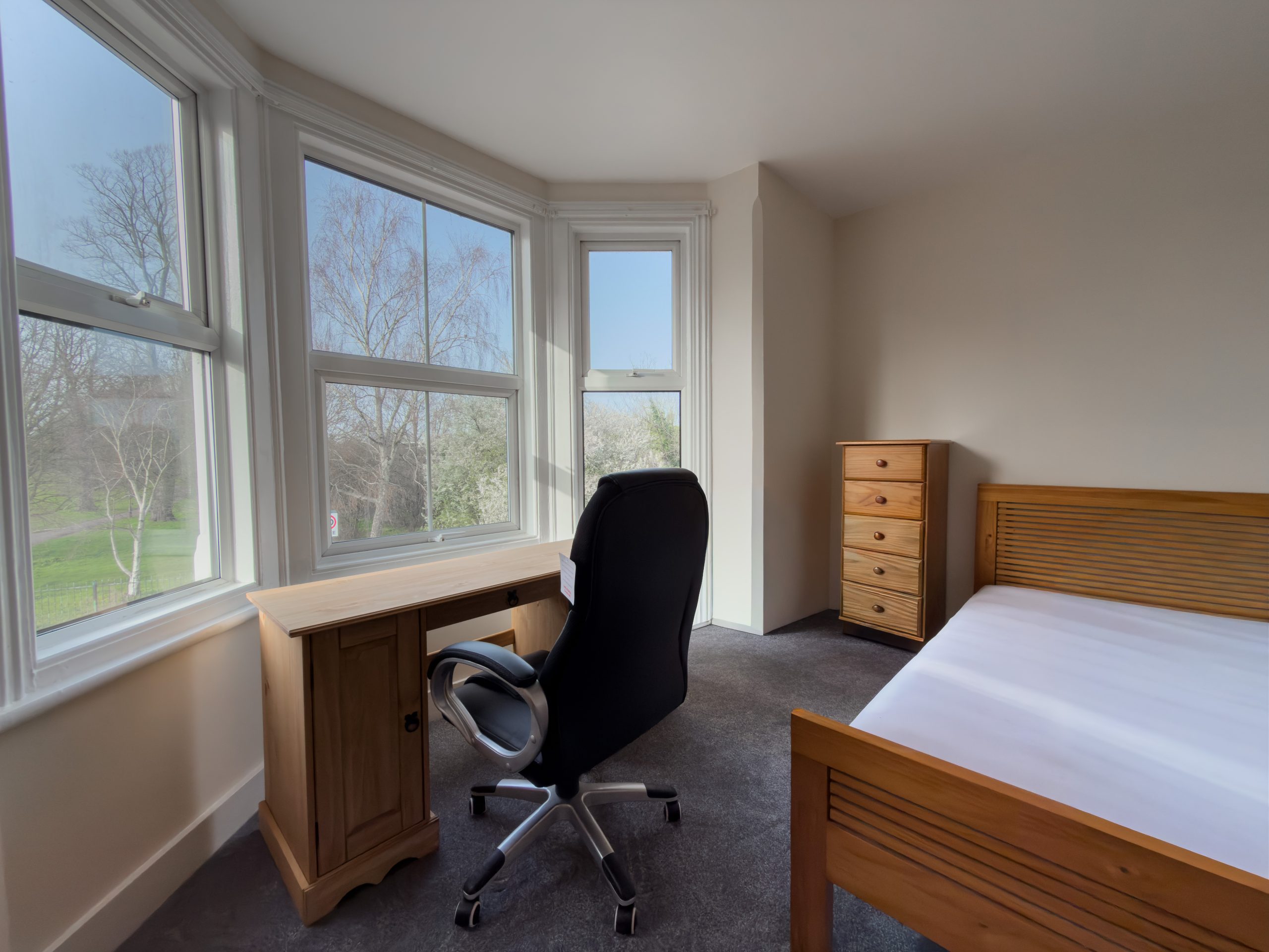 The room benefits from a large window with views across the park and is furnished with a double bed, desk and chair, wardrobe, and chest of drawers, providing a comfortable space for both relaxing and working.